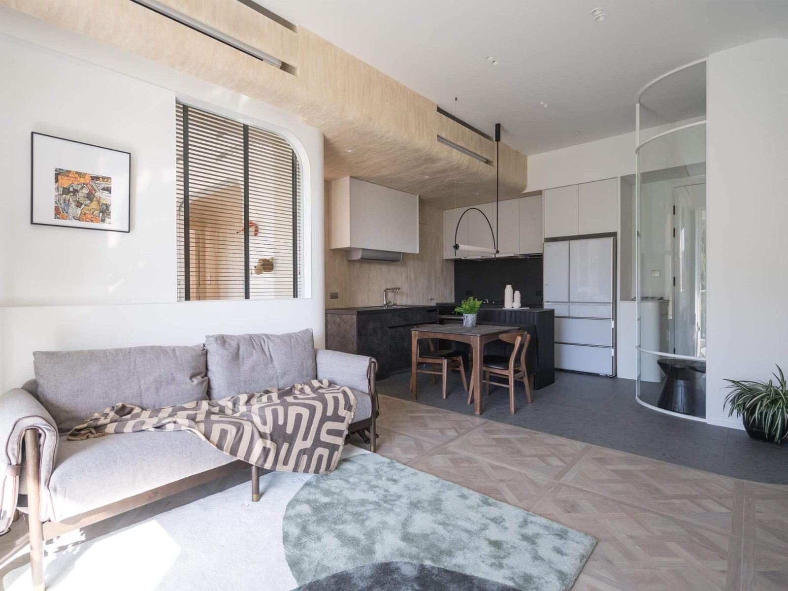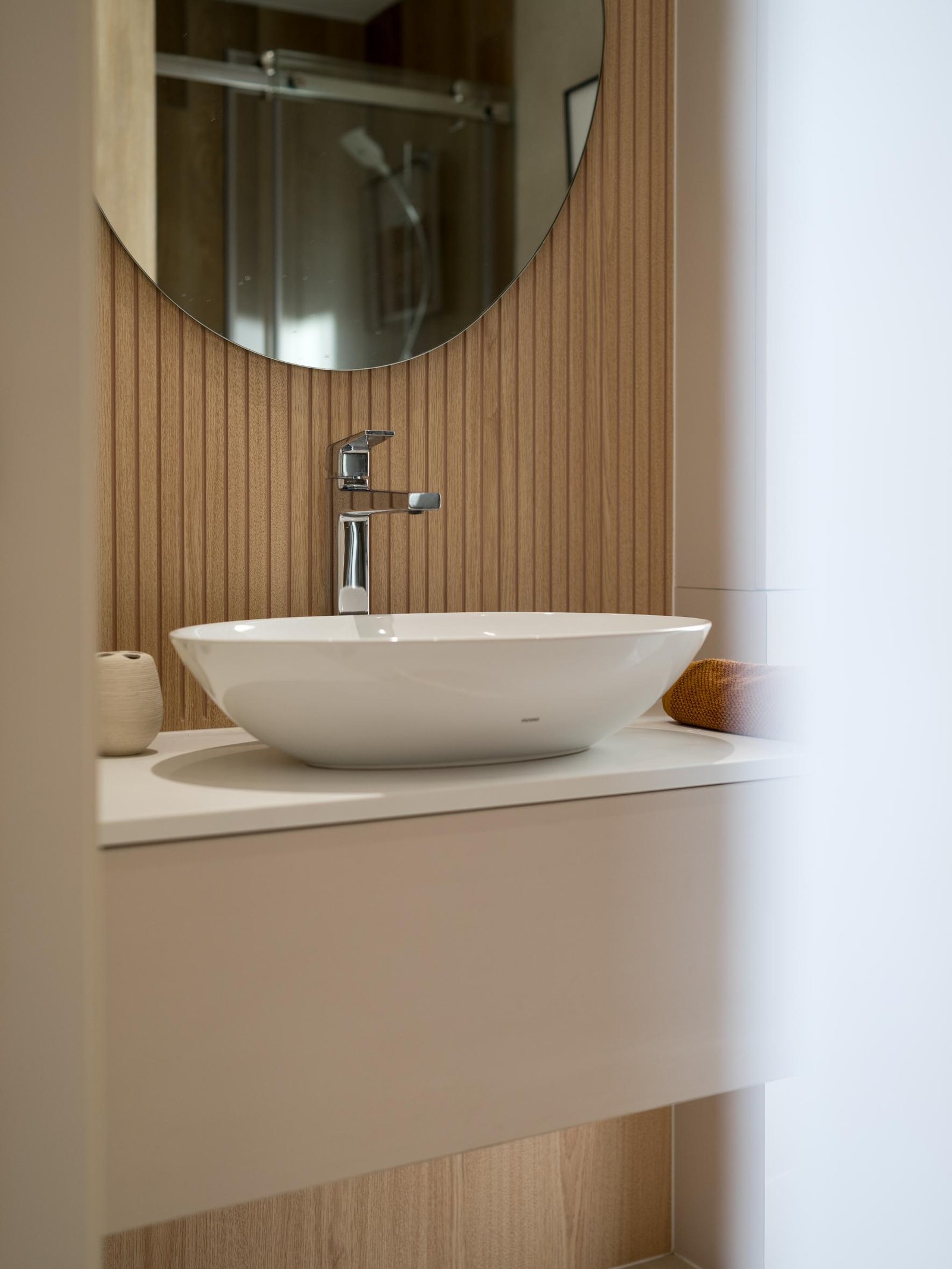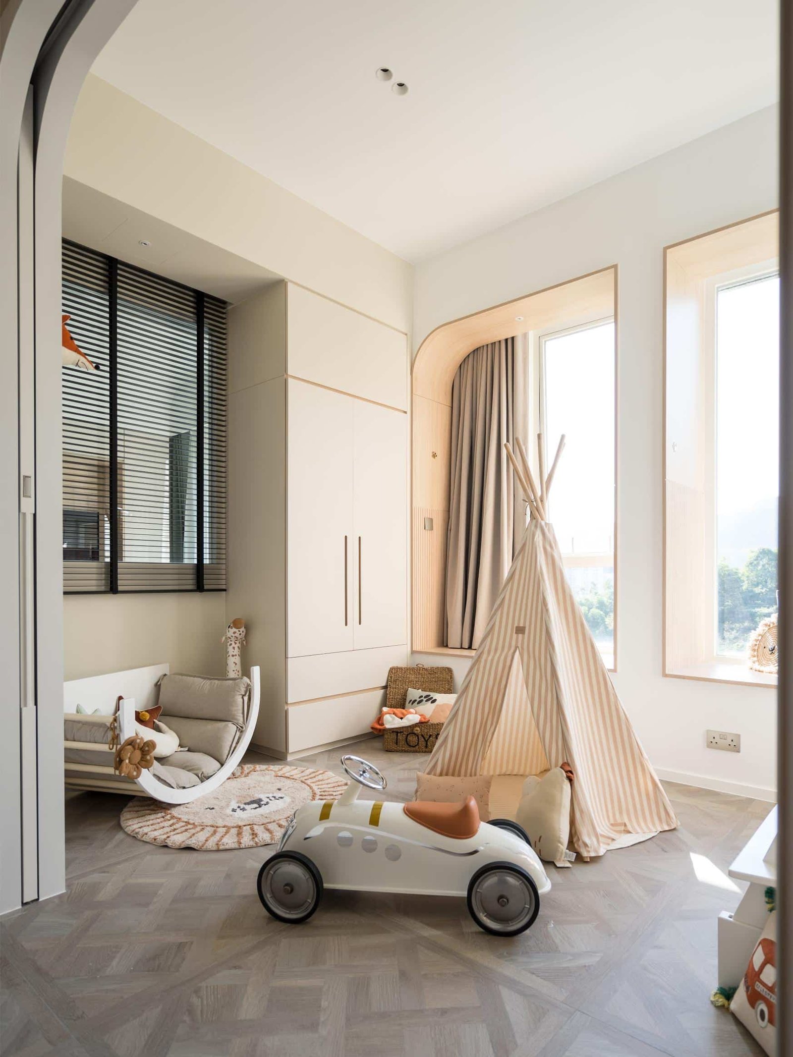 主人房以木和白簡約設計,推開拱門進入主浴室。將原有衣帽間和浴室打通,改為集梳妝及淋浴浸浴在內的主人房浴室。
