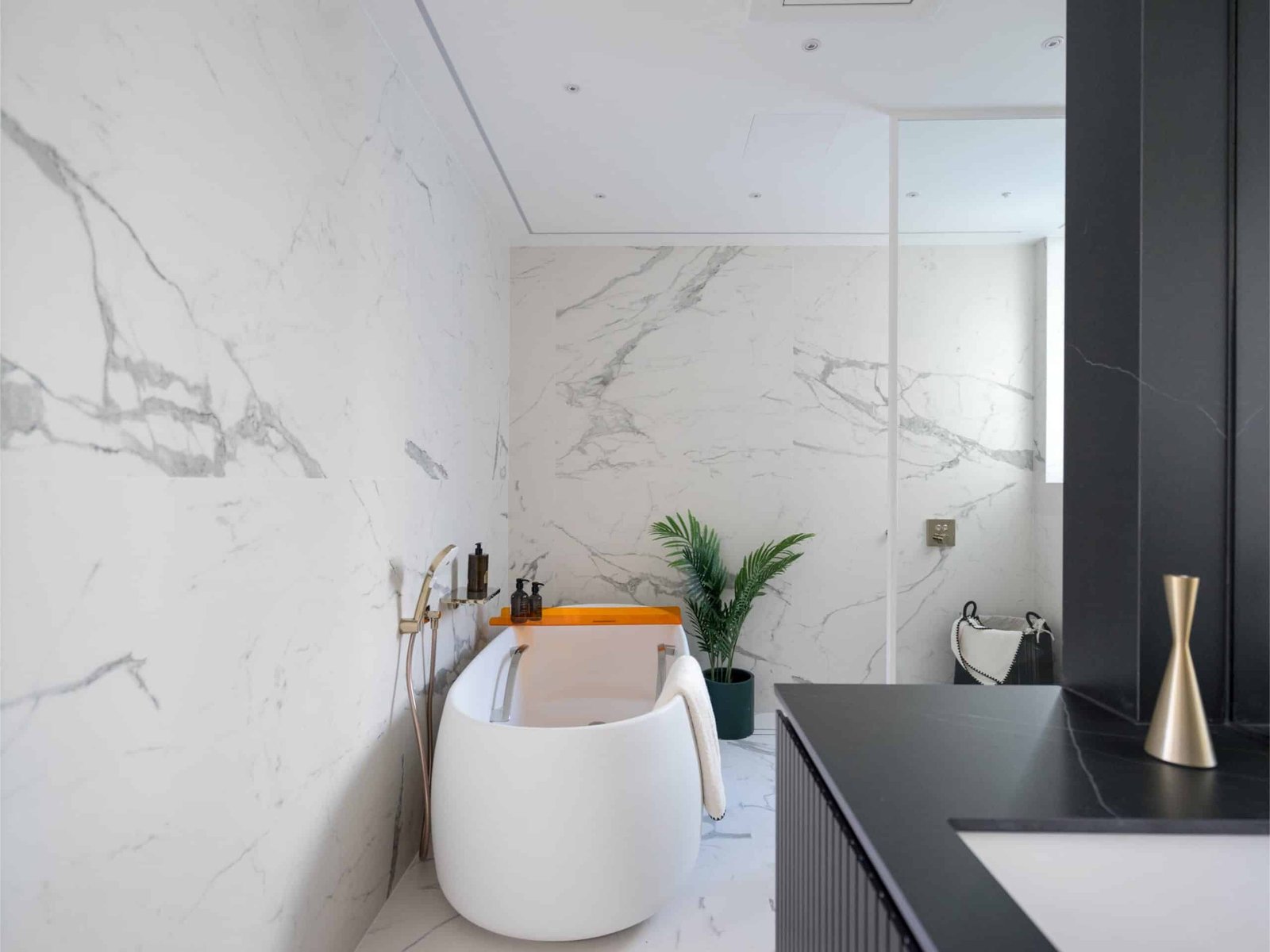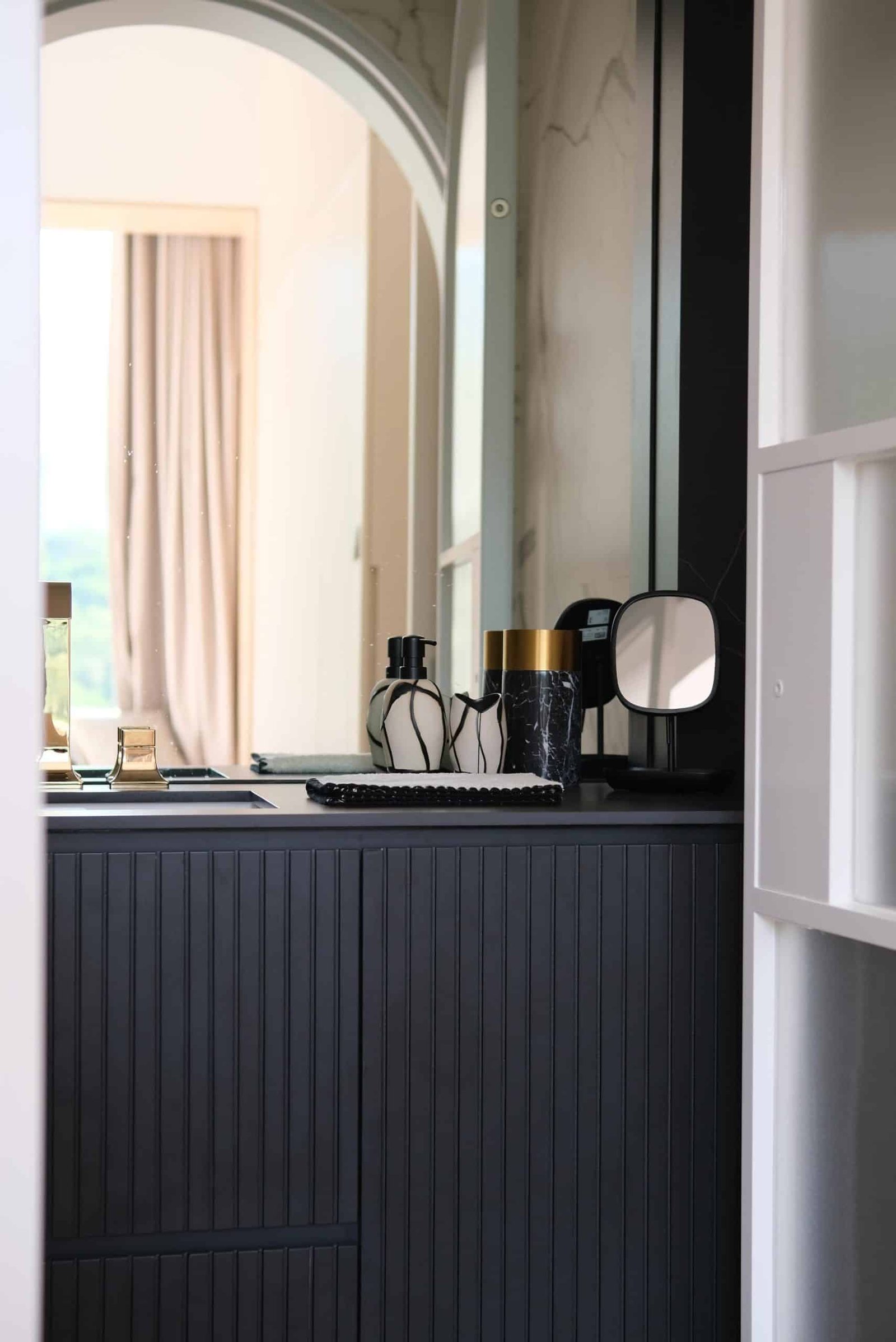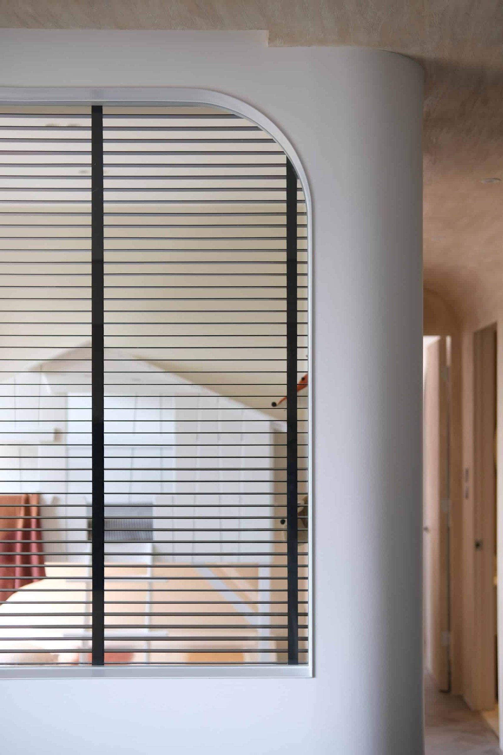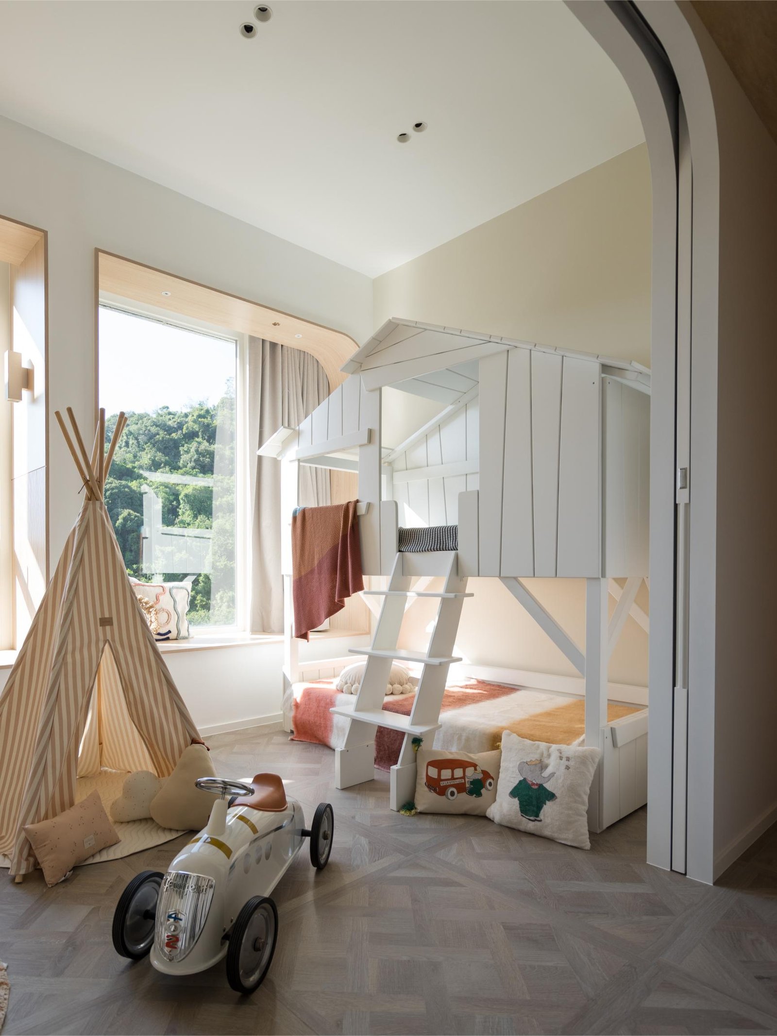 主人房以木和白簡約設計,推開拱門進入主浴室。將原有衣帽間和浴室打通,改為集梳妝及淋浴浸浴在內的主人房浴室。