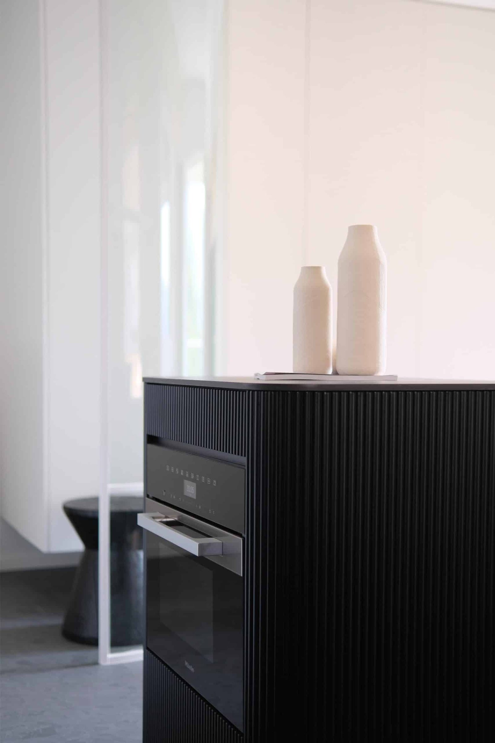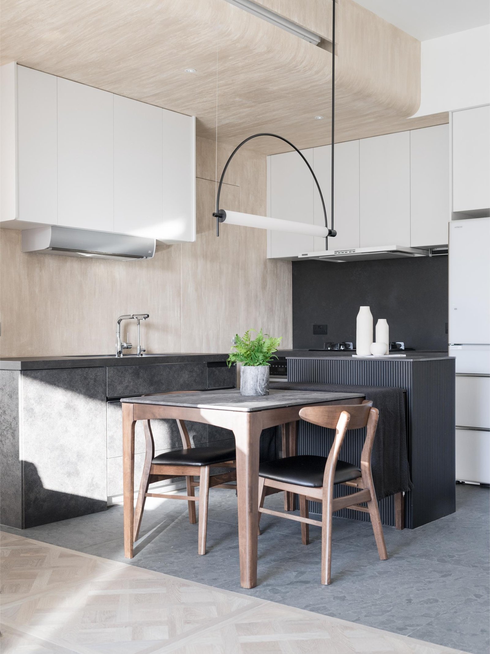 玄關及改動間隔後的開放式廚房 由黑與白組合而成。用意是在沒有任何間隔及保持空間感下 亦能在視覺上分辨出兩個區域 。