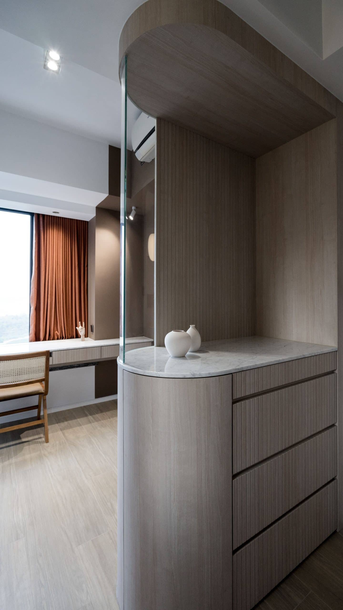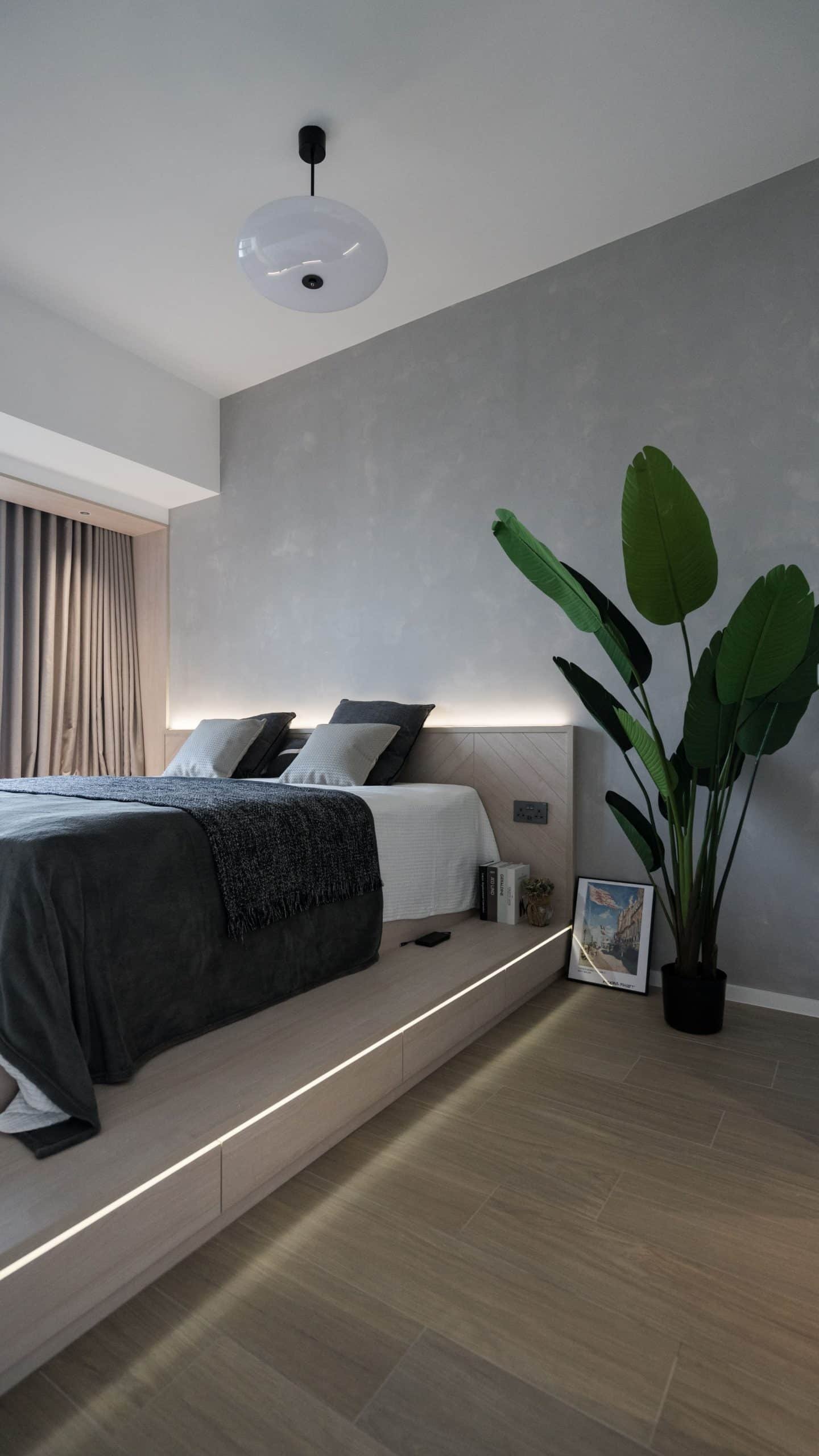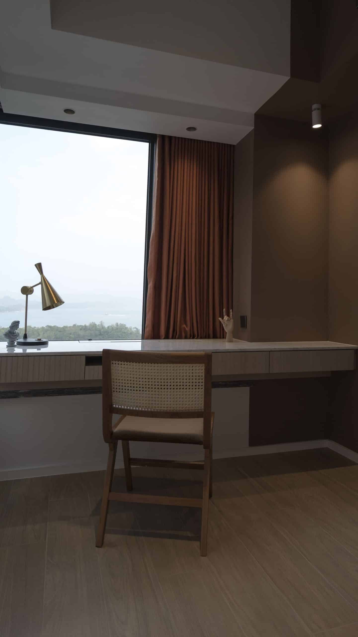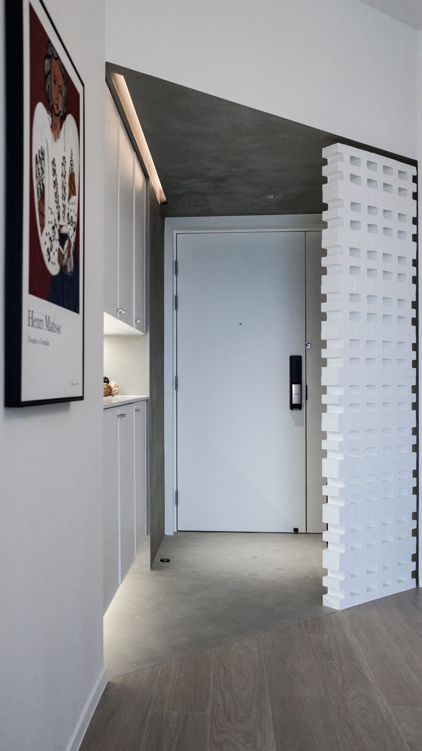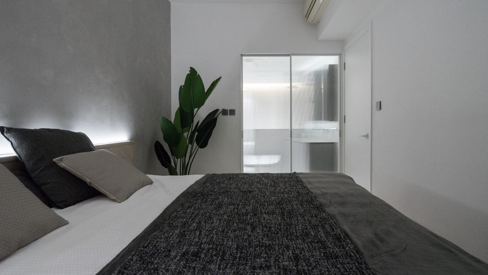 單位的飯廳及客應呈偏長的形狀,左右兩邊的主力牆分隔開房間及廚房浴室。 進入單位時先經過全水泥藝術漆的玄關,水泥的地上藏著數隻貓腳印圖案,意味單位中的貓咪亦是單位中的同居者。 改動後 原位於左邊的兩房變為一大衣帽間,並將屋主日常工作的書桌擺放於正向著全海景的位置中。原位於右邊的同面積兩浴室,則改變為一主人房連主浴室空間。 主人房沿用簡約設計,簡單儲物地台連6尺床,透過玻璃對趟門,進入由原客廁和主廁打通的主浴室,擴大後的浴室使梳洗區及沐浴浸浴區分開,空間感十足,配上單位的智能家居系統,調校浸浴模式的燈光及音樂效果,好好在空間感下享受及放鬆手心。