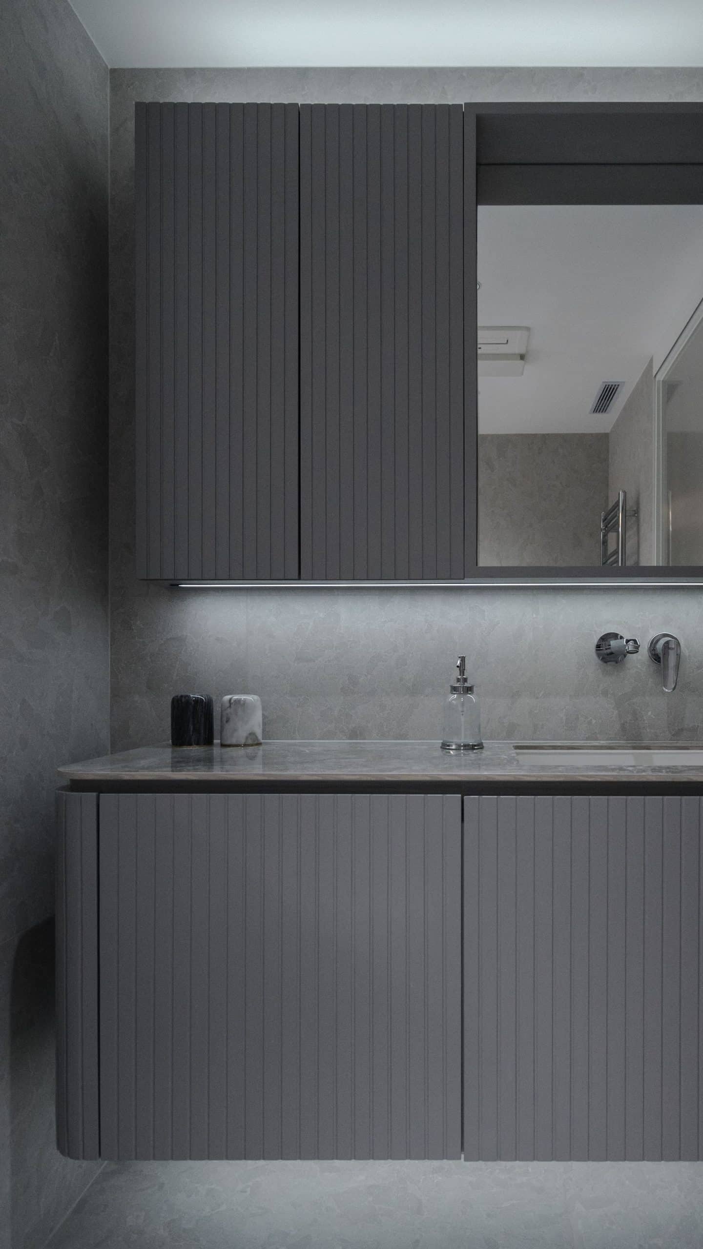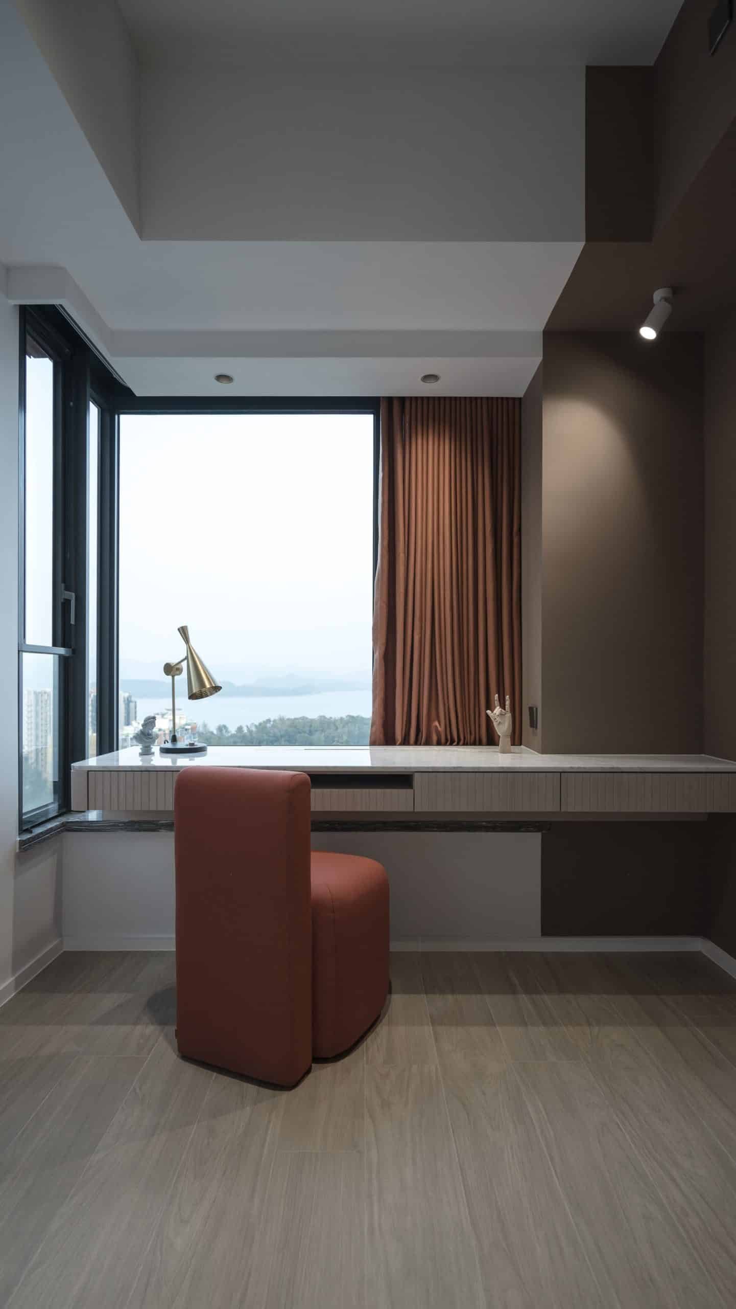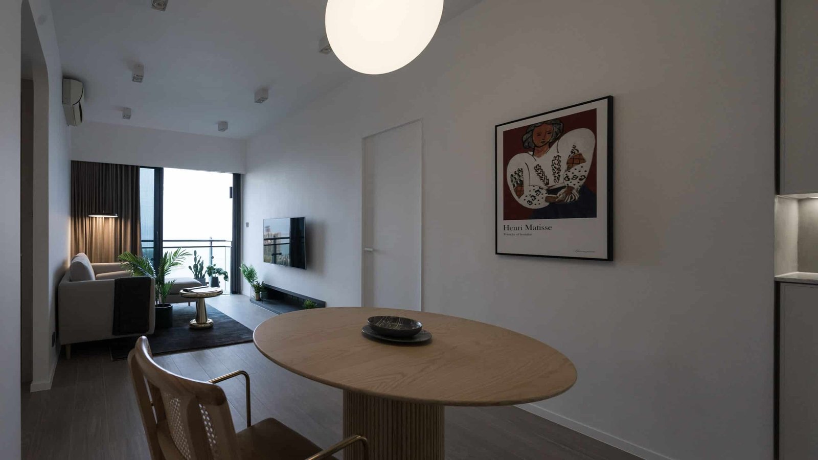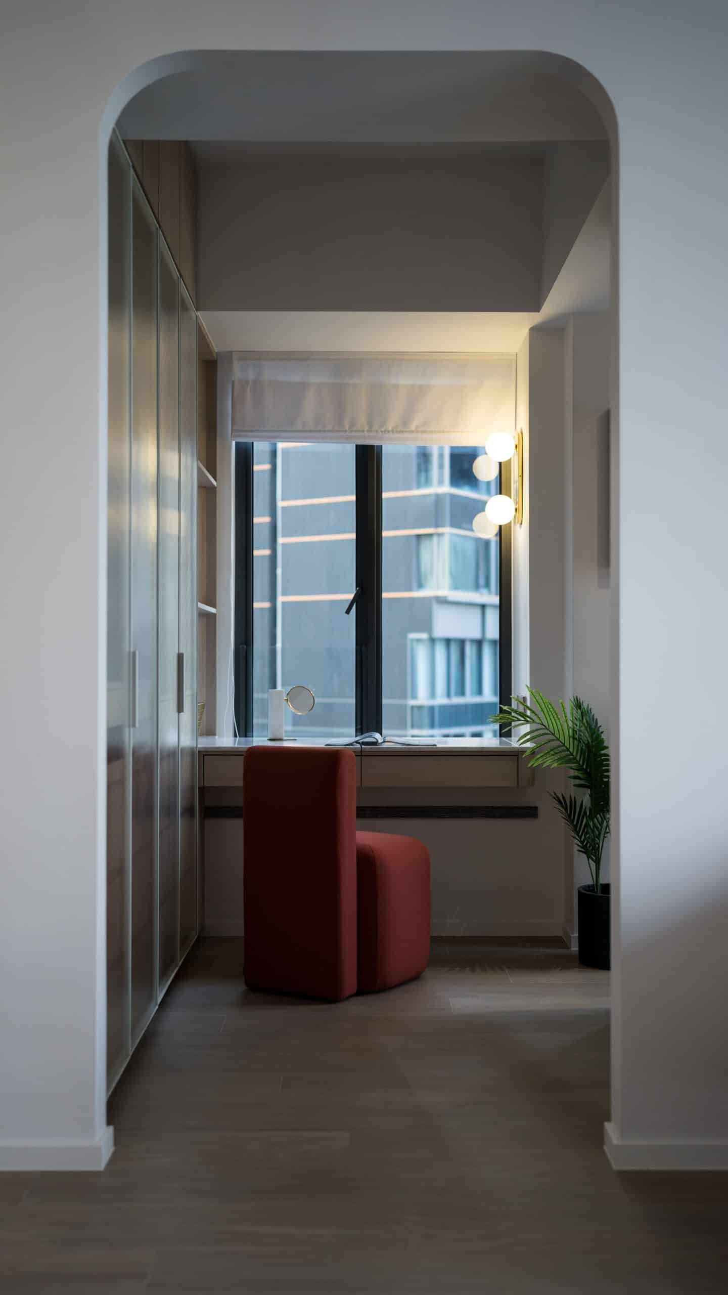 單位的飯廳及客應呈偏長的形狀,左右兩邊的主力牆分隔開房間及廚房浴室。 進入單位時先經過全水泥藝術漆的玄關,水泥的地上藏著數隻貓腳印圖案,意味單位中的貓咪亦是單位中的同居者。 改動後 原位於左邊的兩房變為一大衣帽間,並將屋主日常工作的書桌擺放於正向著全海景的位置中。原位於右邊的同面積兩浴室,則改變為一主人房連主浴室空間。 主人房沿用簡約設計,簡單儲物地台連6尺床,透過玻璃對趟門,進入由原客廁和主廁打通的主浴室,擴大後的浴室使梳洗區及沐浴浸浴區分開,空間感十足,配上單位的智能家居系統,調校浸浴模式的燈光及音樂效果,好好在空間感下享受及放鬆手心。