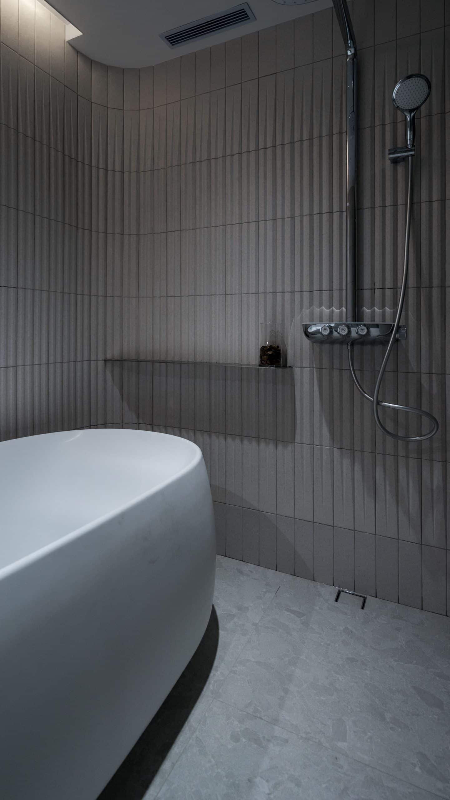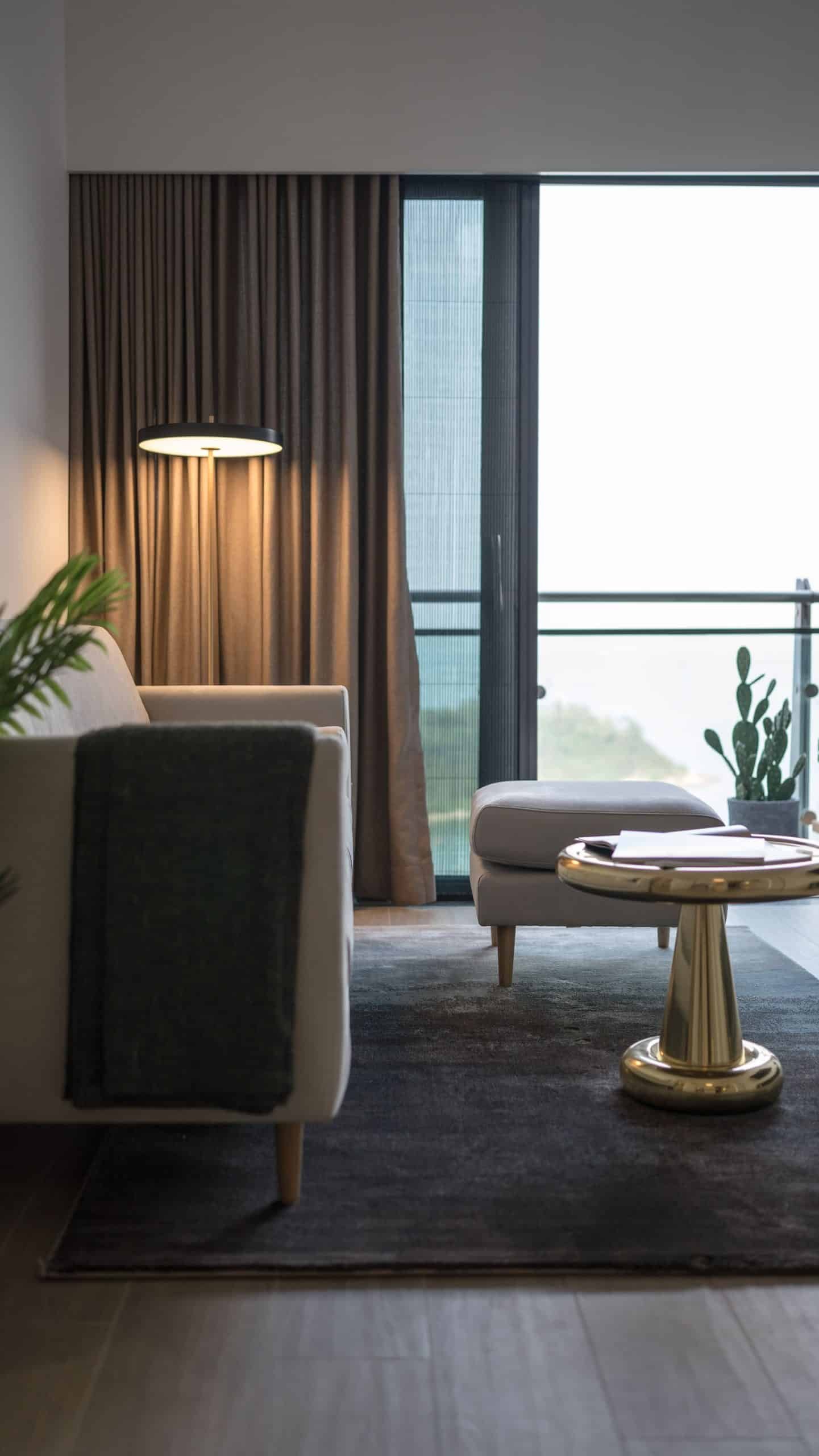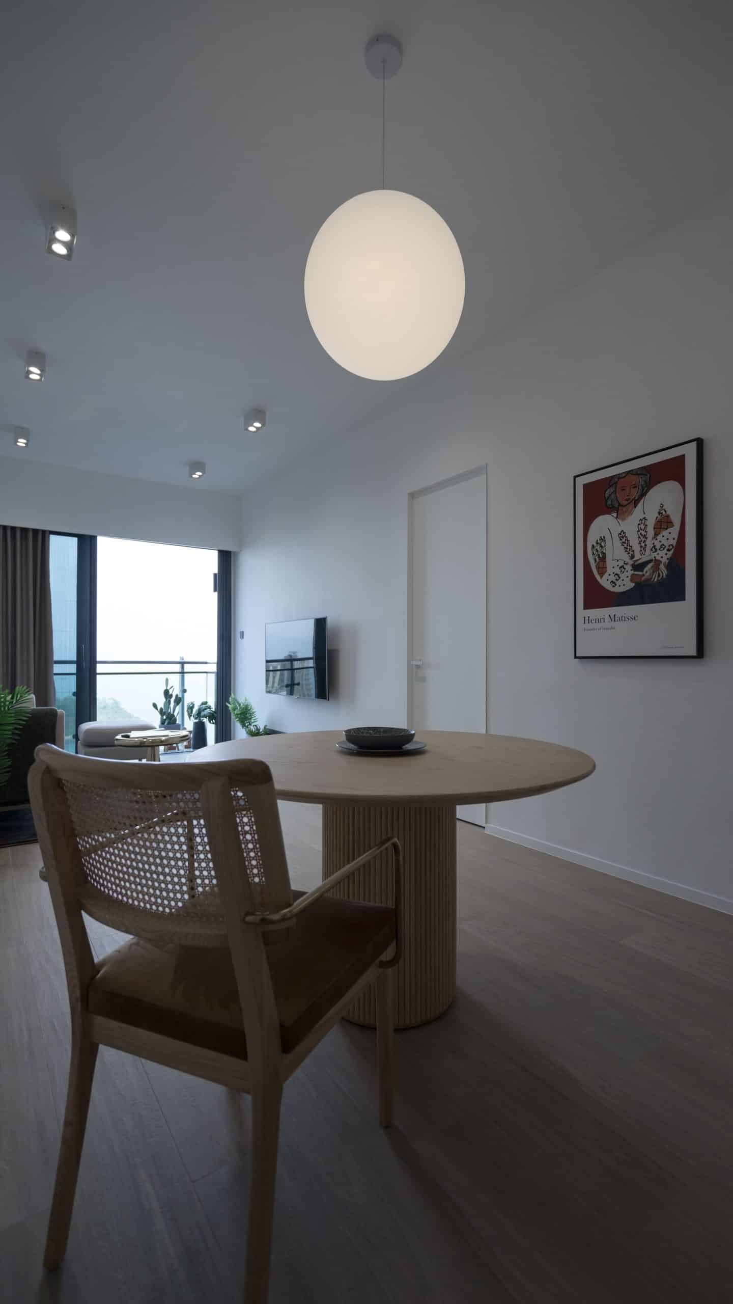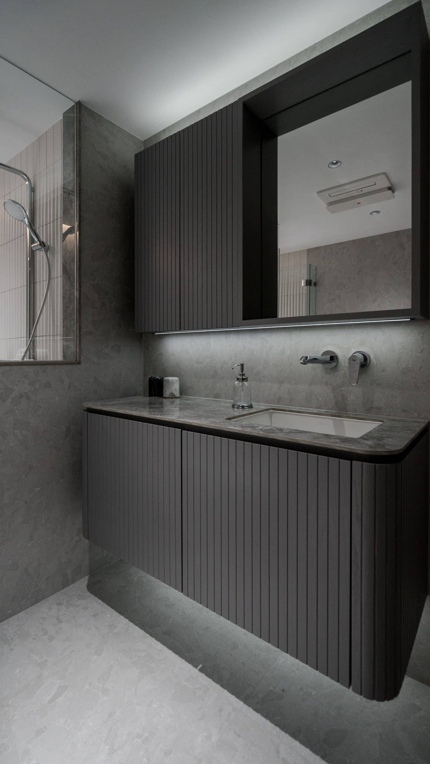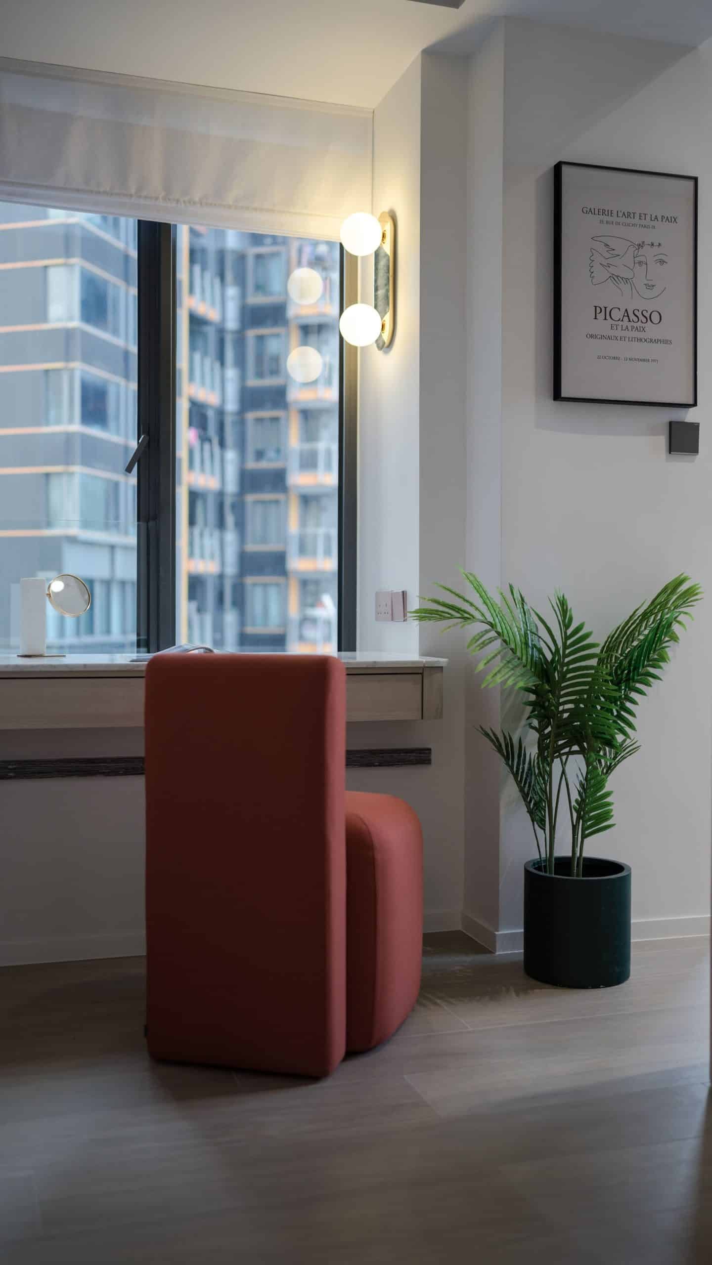 單位的飯廳及客應呈偏長的形狀,左右兩邊的主力牆分隔開房間及廚房浴室。 進入單位時先經過全水泥藝術漆的玄關,水泥的地上藏著數隻貓腳印圖案,意味單位中的貓咪亦是單位中的同居者。 改動後 原位於左邊的兩房變為一大衣帽間,並將屋主日常工作的書桌擺放於正向著全海景的位置中。原位於右邊的同面積兩浴室,則改變為一主人房連主浴室空間。 主人房沿用簡約設計,簡單儲物地台連6尺床,透過玻璃對趟門,進入由原客廁和主廁打通的主浴室,擴大後的浴室使梳洗區及沐浴浸浴區分開,空間感十足,配上單位的智能家居系統,調校浸浴模式的燈光及音樂效果,好好在空間感下享受及放鬆手心。