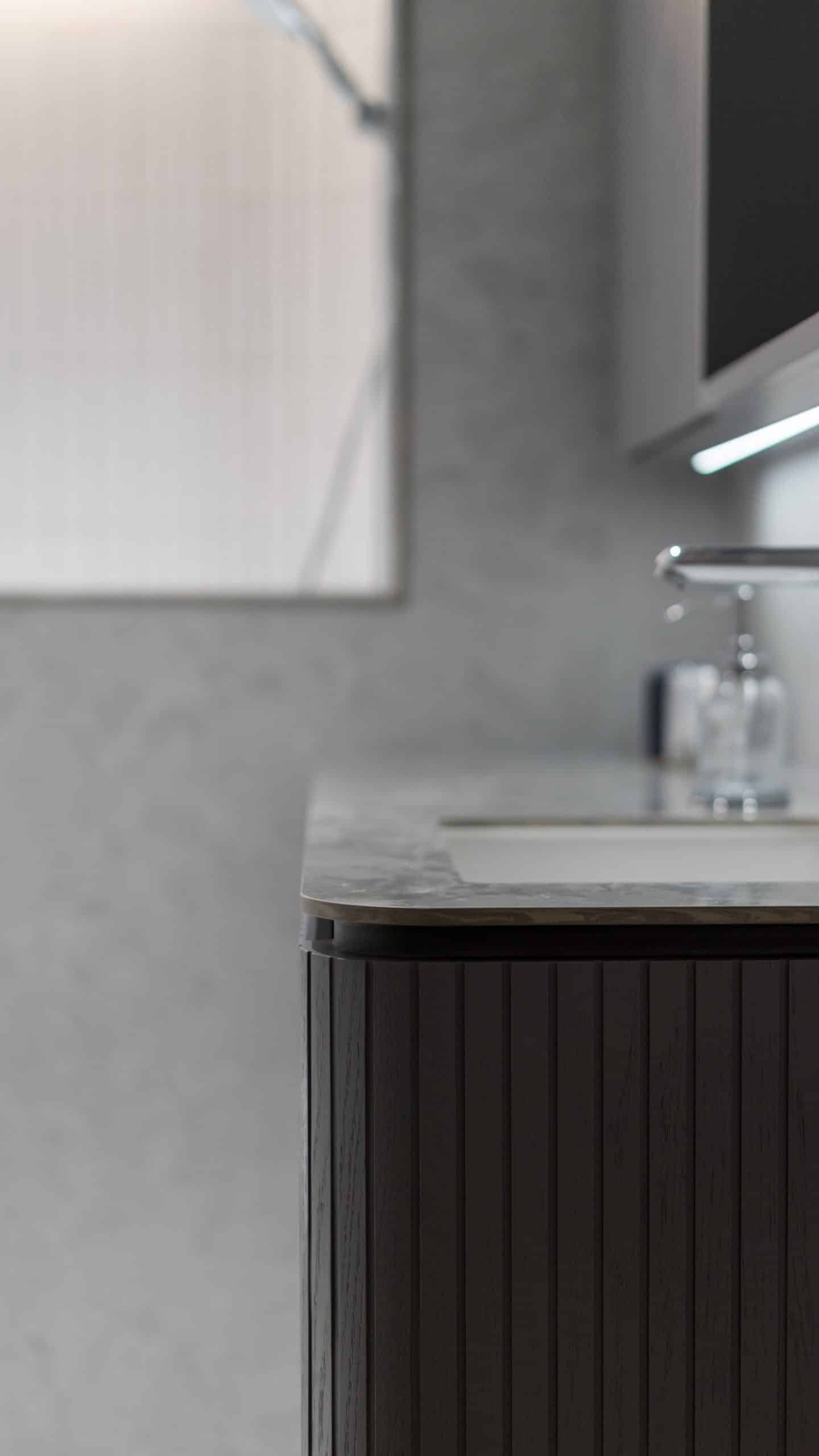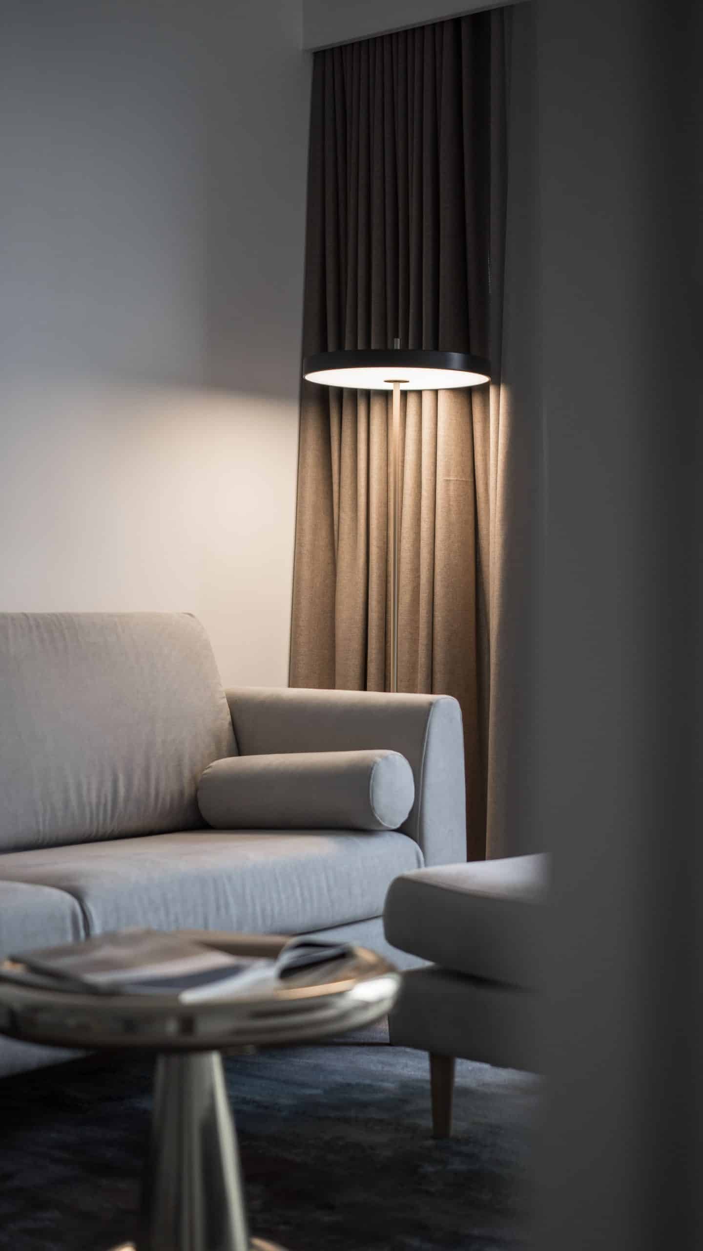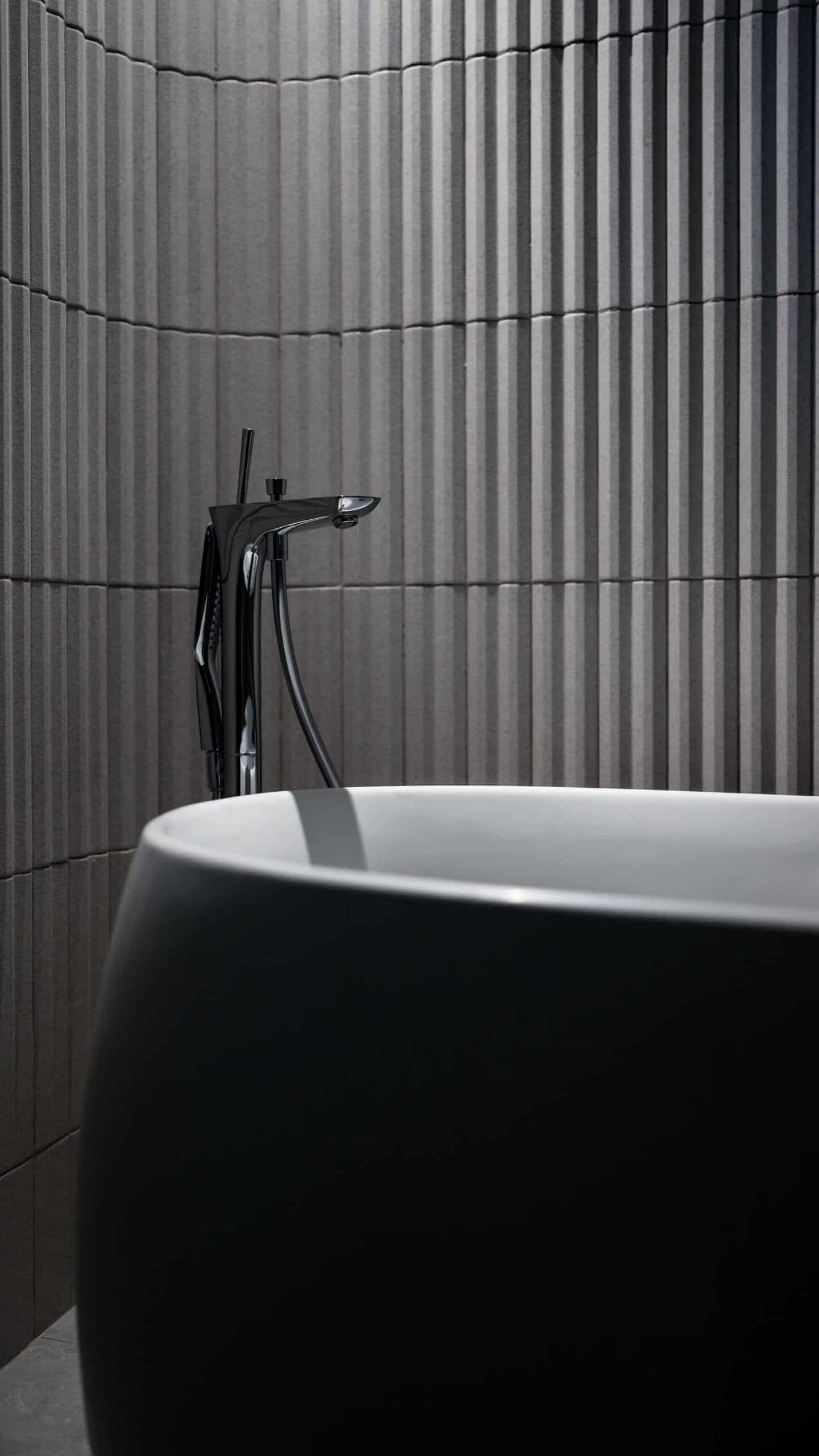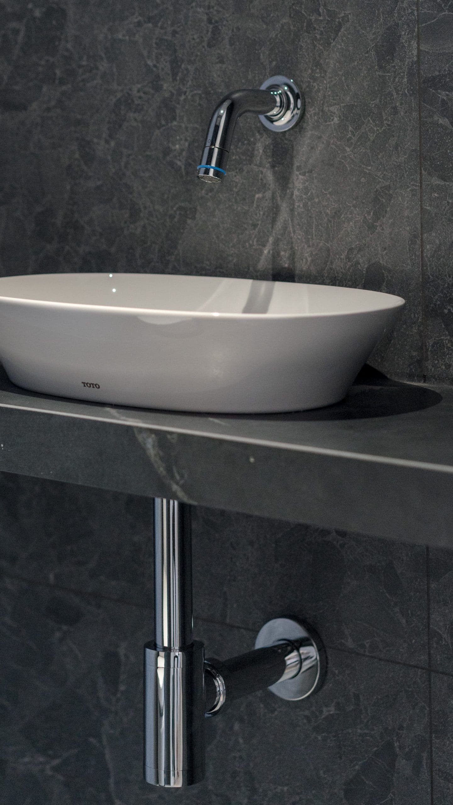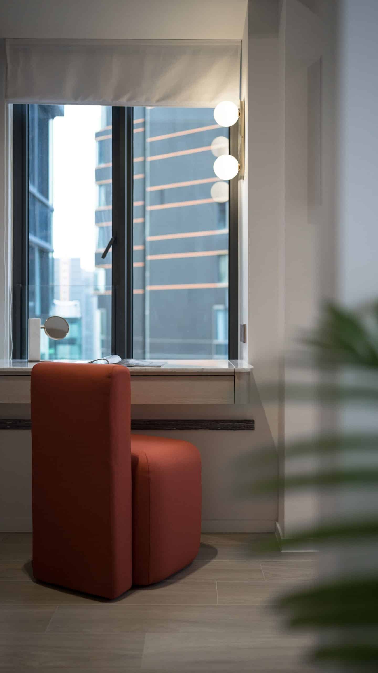 單位的飯廳及客應呈偏長的形狀,左右兩邊的主力牆分隔開房間及廚房浴室。 進入單位時先經過全水泥藝術漆的玄關,水泥的地上藏著數隻貓腳印圖案,意味單位中的貓咪亦是單位中的同居者。 改動後 原位於左邊的兩房變為一大衣帽間,並將屋主日常工作的書桌擺放於正向著全海景的位置中。原位於右邊的同面積兩浴室,則改變為一主人房連主浴室空間。 主人房沿用簡約設計,簡單儲物地台連6尺床,透過玻璃對趟門,進入由原客廁和主廁打通的主浴室,擴大後的浴室使梳洗區及沐浴浸浴區分開,空間感十足,配上單位的智能家居系統,調校浸浴模式的燈光及音樂效果,好好在空間感下享受及放鬆手心。