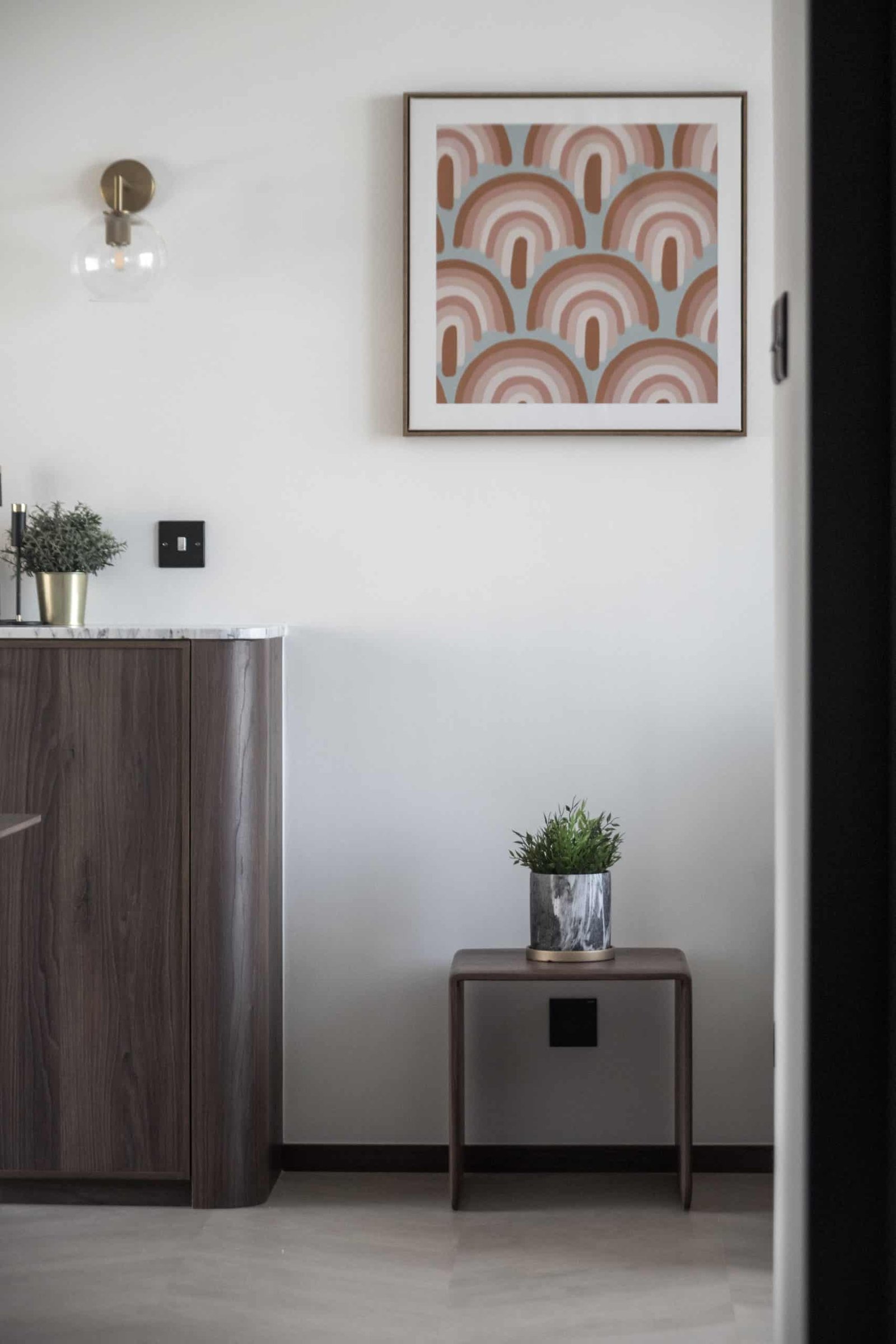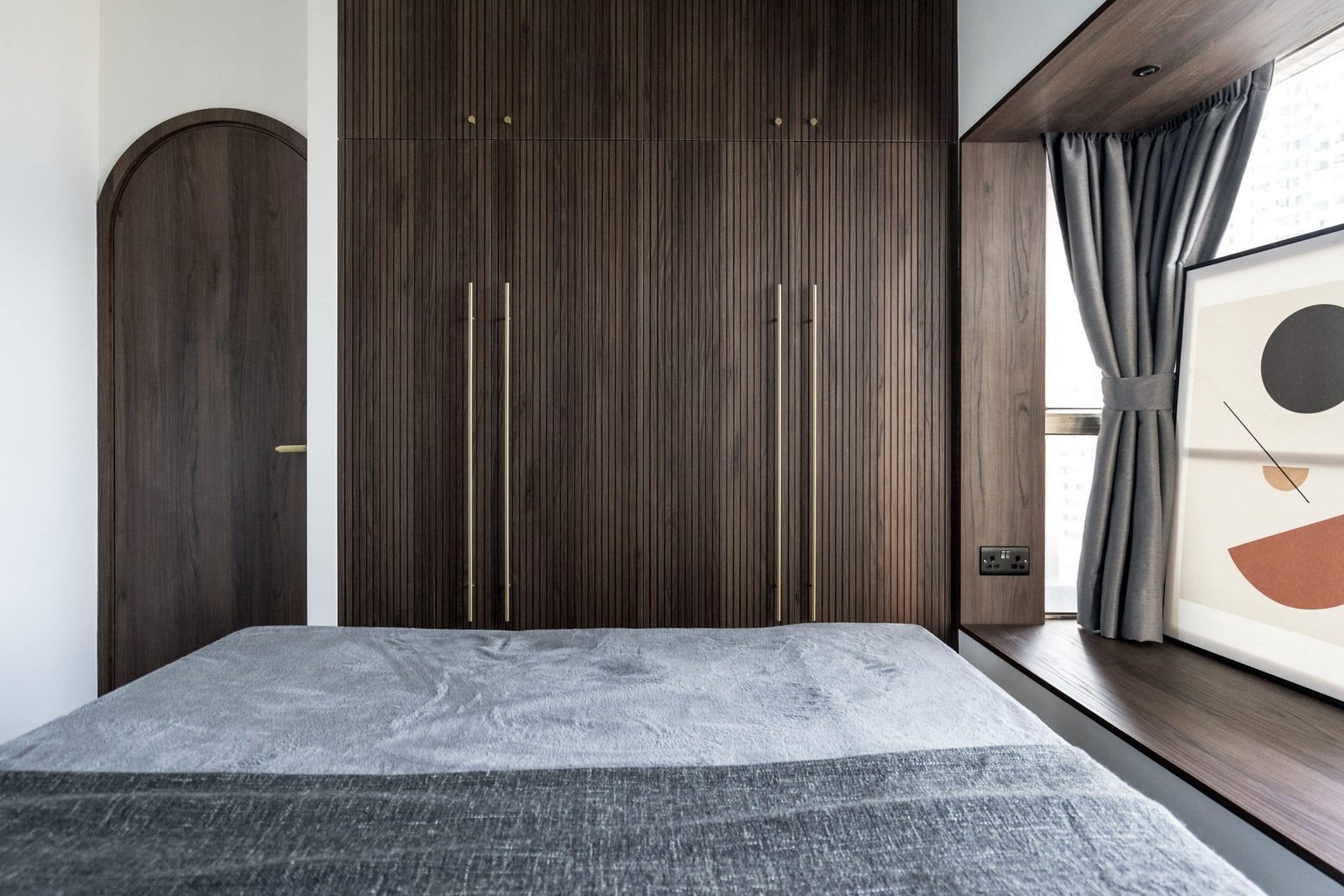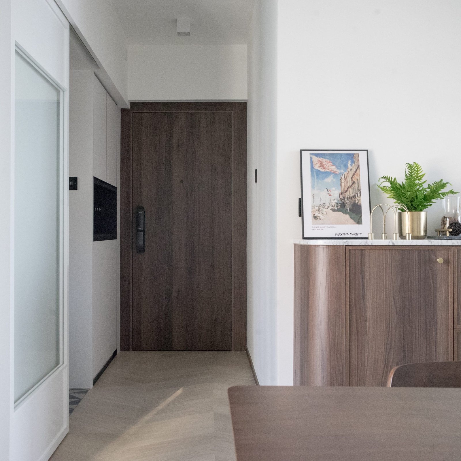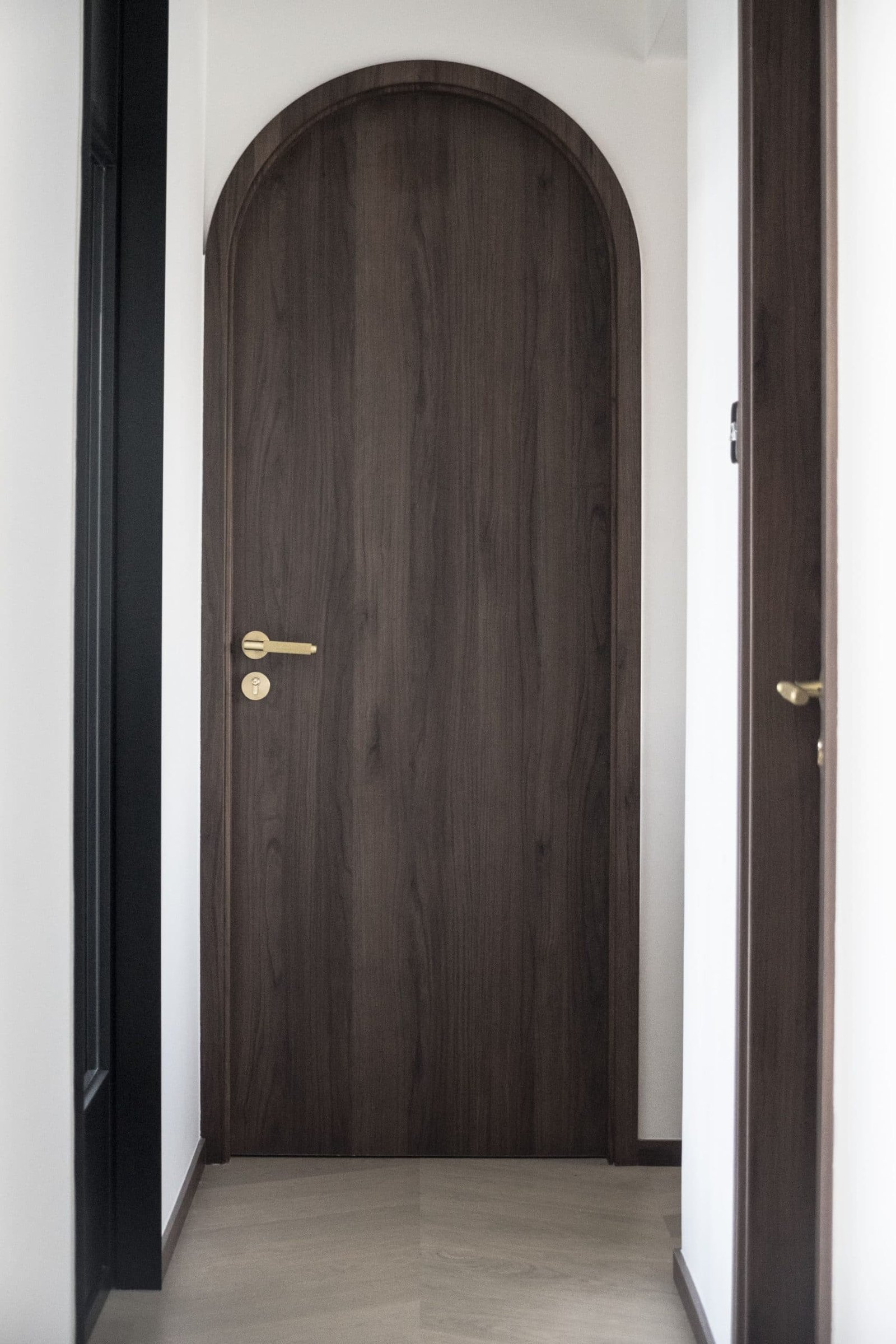 原則玄關走廊感覺偏暗偏窄,改為由鞋櫃代替原有廚房牆身 保持玄關的空間及視覺上的寬闊 地板用上箭紋及弧形牆角 將視線帶動到單位的客飯廳。 孩子們的房間以玻璃對趟打開,既加強光線照明及空間感,亦能增加家人們的交流及互動。 推開拱型的房門 進入主人房空間 床頭部份用上直條木紋及水泥藝術油漆 主浴室亦以全黑色打造 與客浴室的柔和感覺不同 單位以簡約為主,全屋木紋的部份配上金色抽手等配件作點綴。
