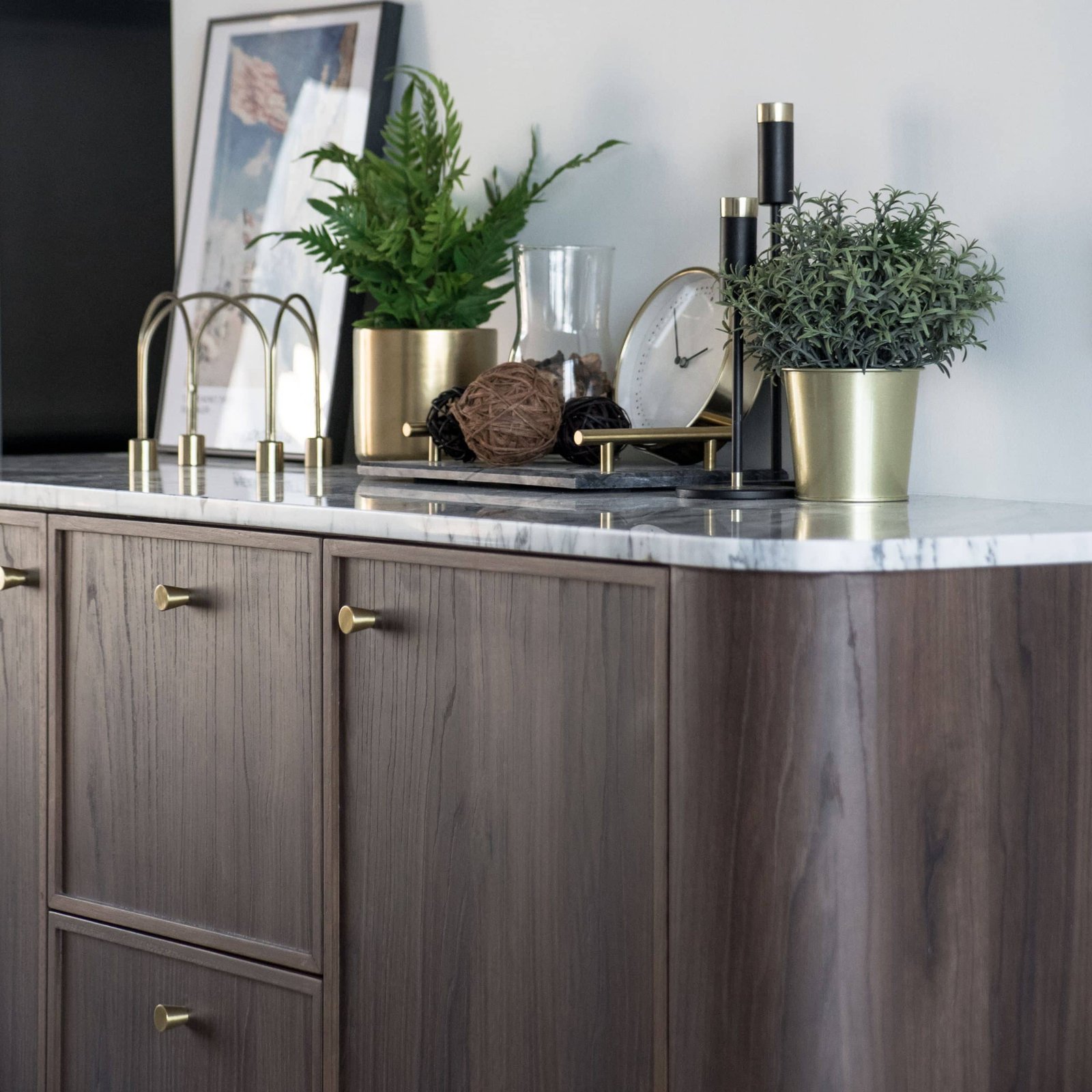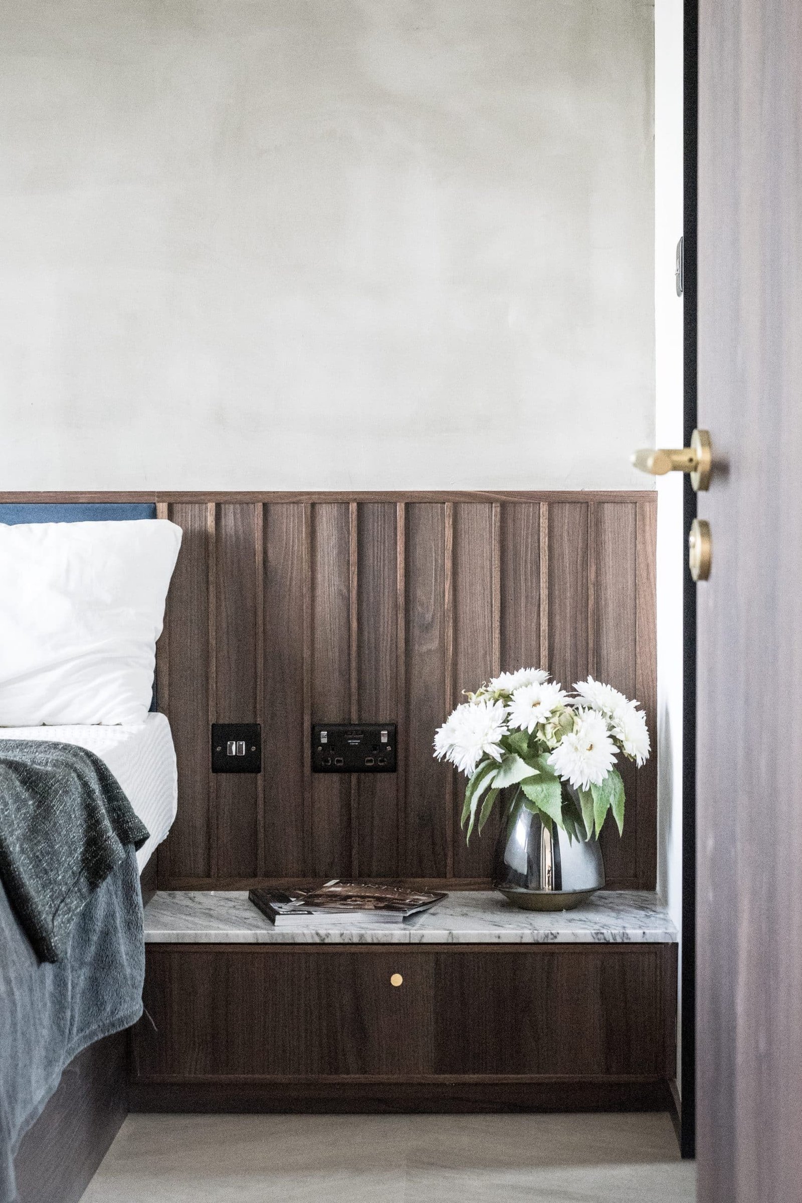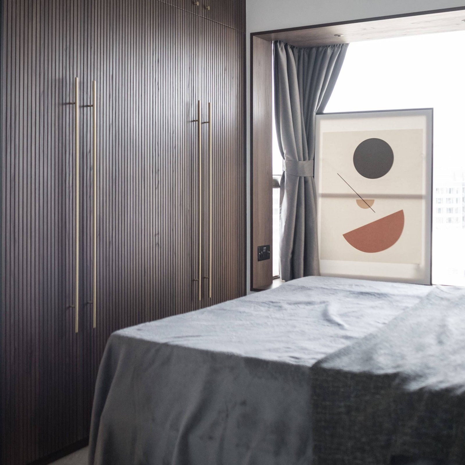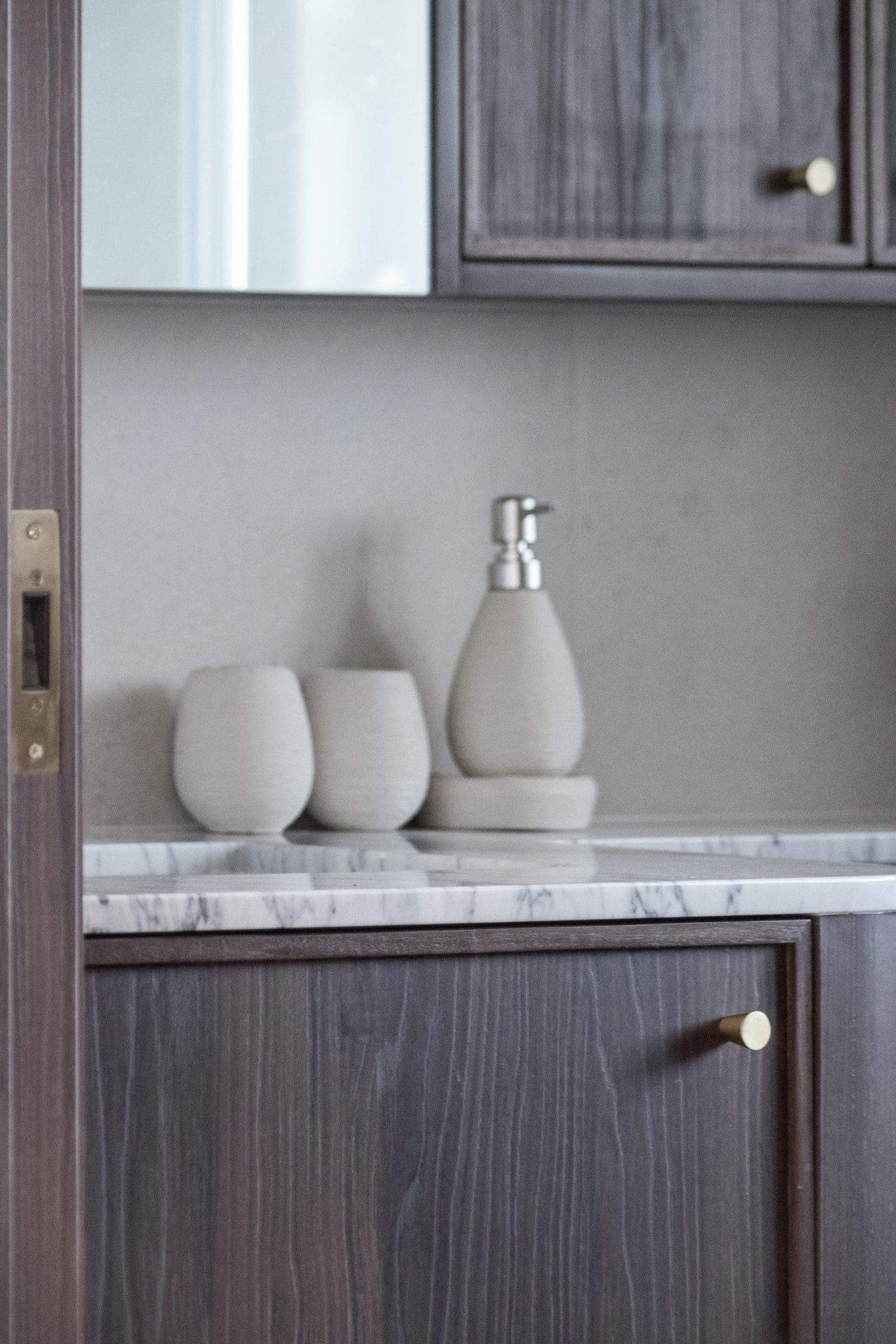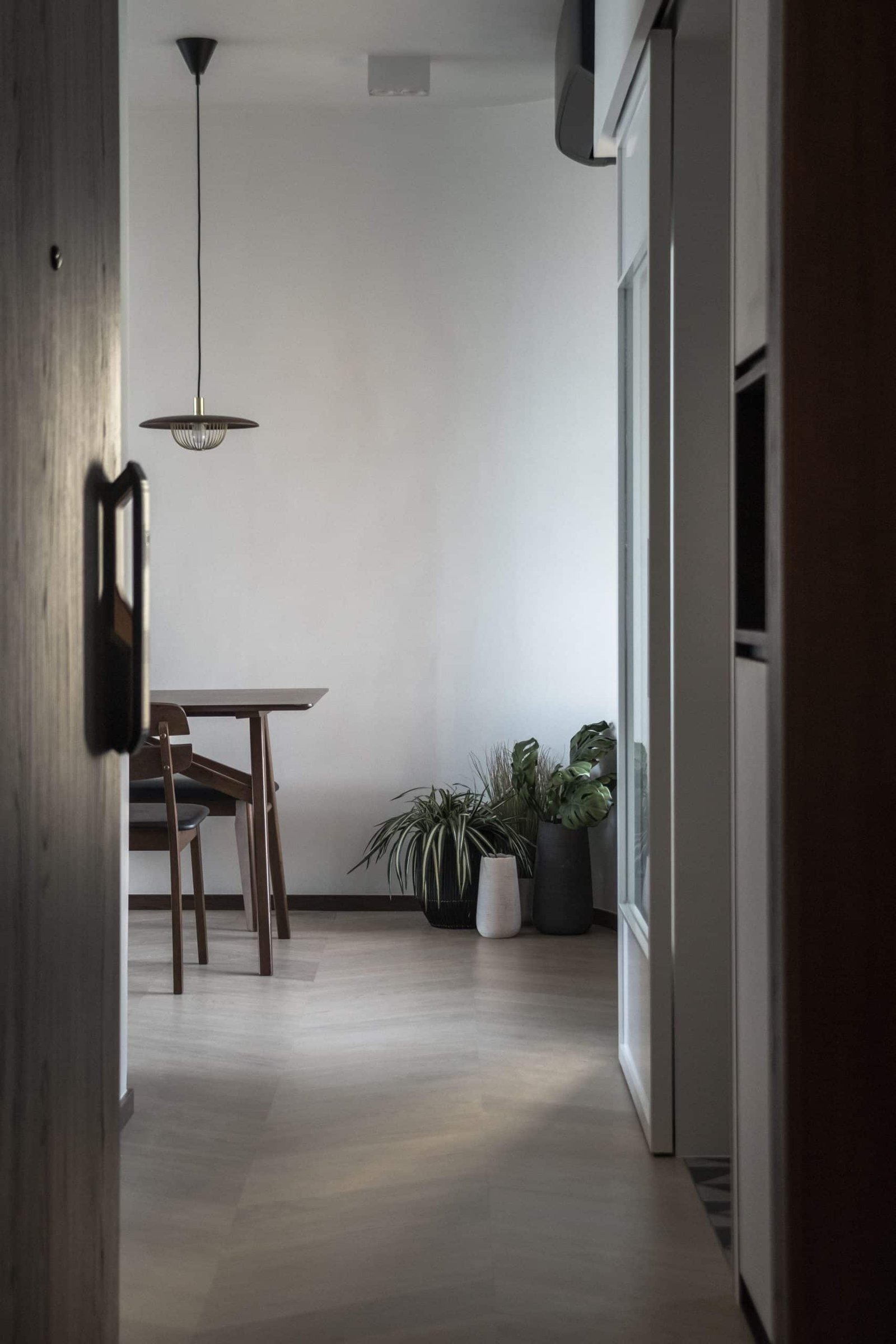 原則玄關走廊感覺偏暗偏窄,改為由鞋櫃代替原有廚房牆身 保持玄關的空間及視覺上的寬闊 地板用上箭紋及弧形牆角 將視線帶動到單位的客飯廳。 孩子們的房間以玻璃對趟打開,既加強光線照明及空間感,亦能增加家人們的交流及互動。 推開拱型的房門 進入主人房空間 床頭部份用上直條木紋及水泥藝術油漆 主浴室亦以全黑色打造 與客浴室的柔和感覺不同 單位以簡約為主,全屋木紋的部份配上金色抽手等配件作點綴。